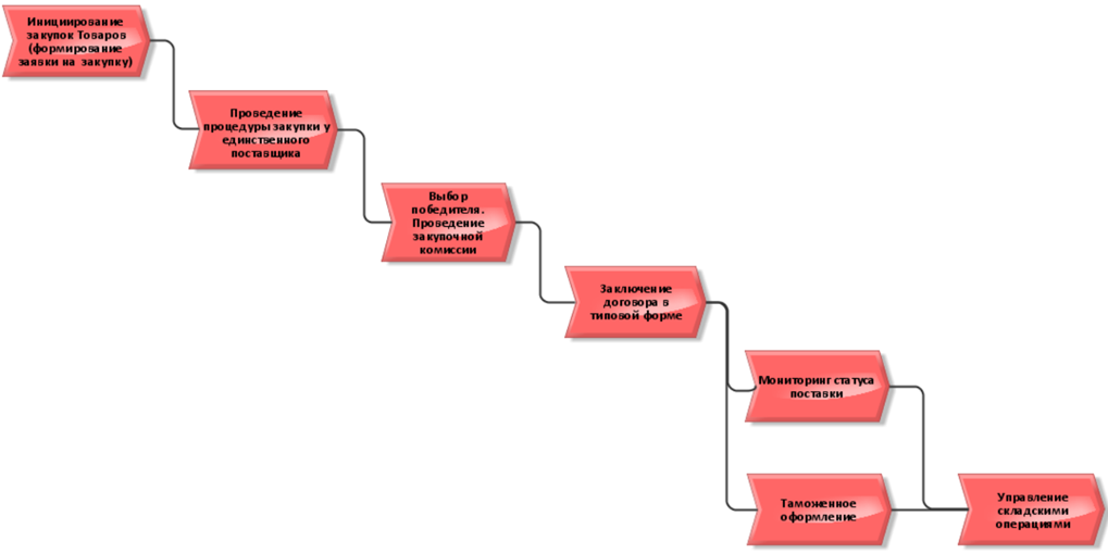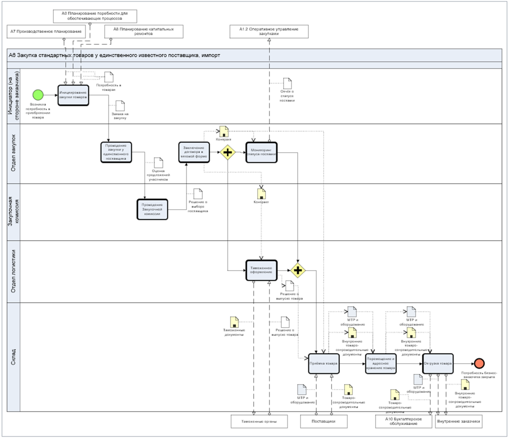 Рис. 6. Сценарий (процесс на ссылках) закупки стандартных товаров у единственного поставщика по импорту в нотации BPMN