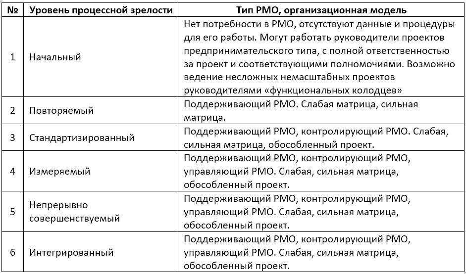 Таблица 2. Модель соответствия уровня процессной зрелости и типа PMO