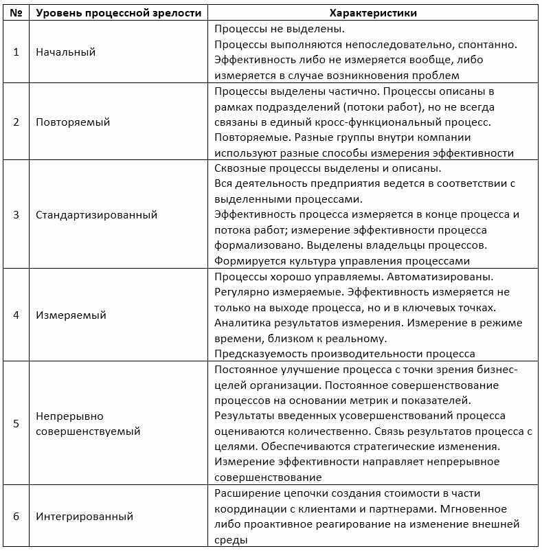 Таблица 1. Обобщённые уровни процессной зрелости компаний на основе моделей CMMI, SPICE, BPMM, Gartner и Forrester (по материалам Вектор науки ТГУ. Серия: Экономика и управление. 2017. № 3 (30), А. И. Лыкова «Сравнительный анализ моделей процессной зрелости»).