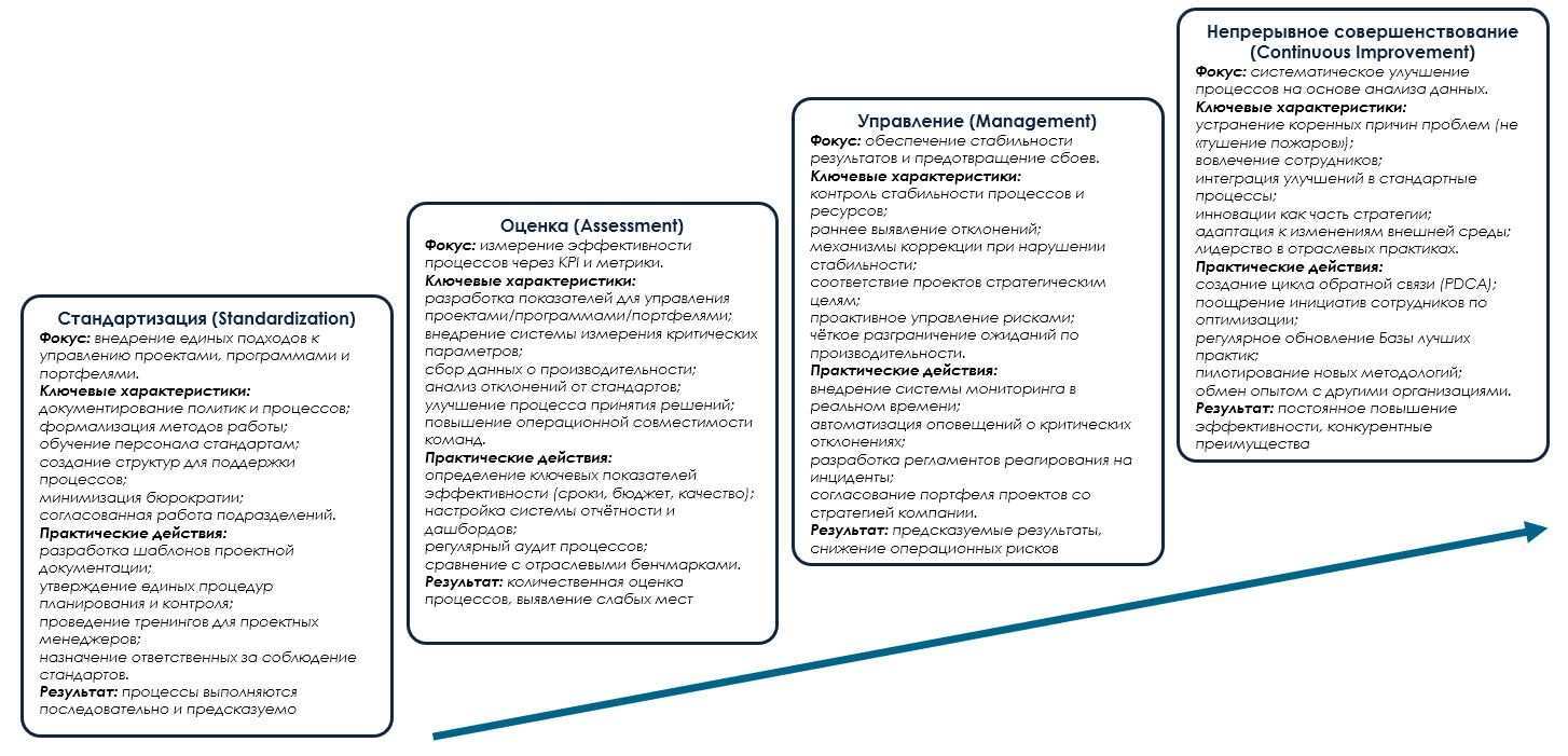 Существуют различные модели проектной и процессной зрелости компаний. Заслуживает внимания стандарт OPM3 (Organizational Project Management Maturity Model) по оценке зрелости управления проектами в организации, разработанный PMI в 2003 году. Модель OPM3 включает 4 уровня зрелости — каждый уровень представляет собой отдельный план развития, модель представлена на рисунке 4.