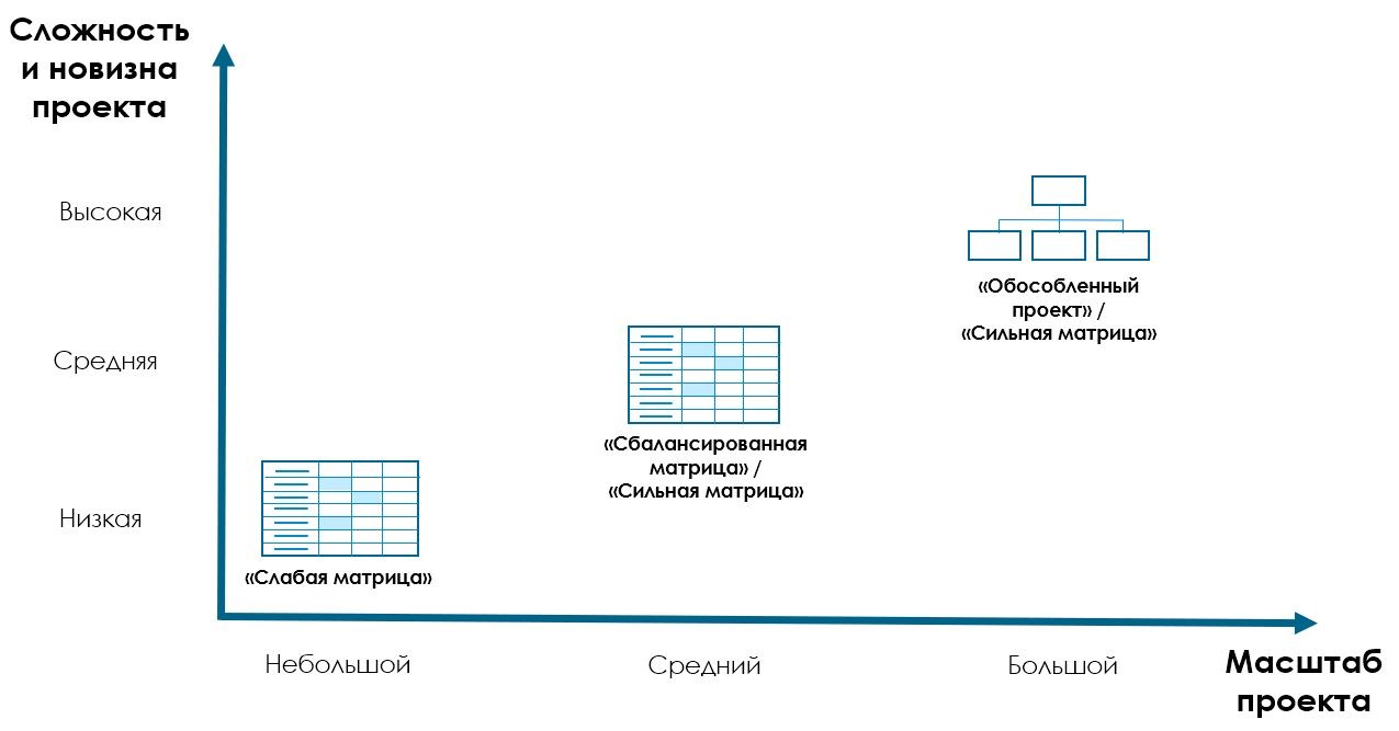 «Матричная» организация предполагает вовлечение работника в проект вплоть до полной загрузки, оставляя его все же в своём «функциональном колодце». Она может быть «слабой» (ближе к функциональной), «сбалансированной» (равновесие проекта и функции) и «сильной» (ближе к проектной). Так, как правило, работают проектные институты, конструкторские бюро и реализуются сложные проекты автоматизации